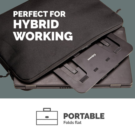 - MINIMISE DISCOMFORT - Help minimise discomfort in your workspace by placing your laptop at a more ergonomically correct viewing position to suit you with the Fellowes Alumia Portable laptop stand, relieving any neck and eye strain