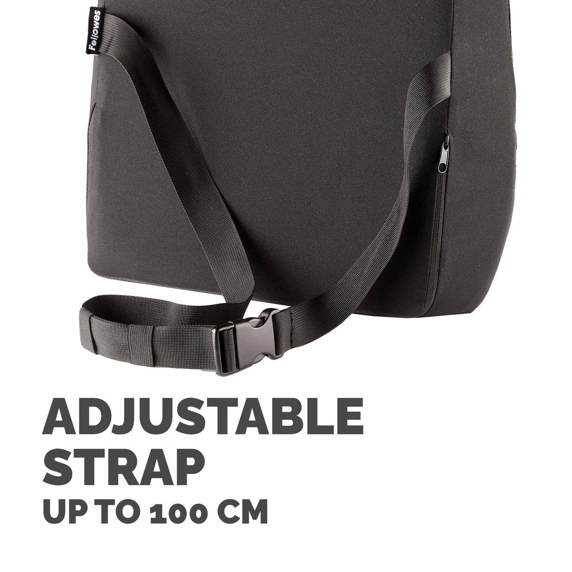 Alleviate back discomfort with the Fellowes Breyta comfort back cushion, which provides essential support and promotes proper ergonomic posture. It features an easy-to-use adjustable strap that holds the cushion securely in place (strap length: 100 cm). Designed for convenience, this cushion also includes a built-in carry handle for easy transportation wherever you work. Made from eco-friendly materials, the foam contains post-consumer recycled content from mattresses, and the fabric cover is crafted from 100% post-consumer recycled polyester.