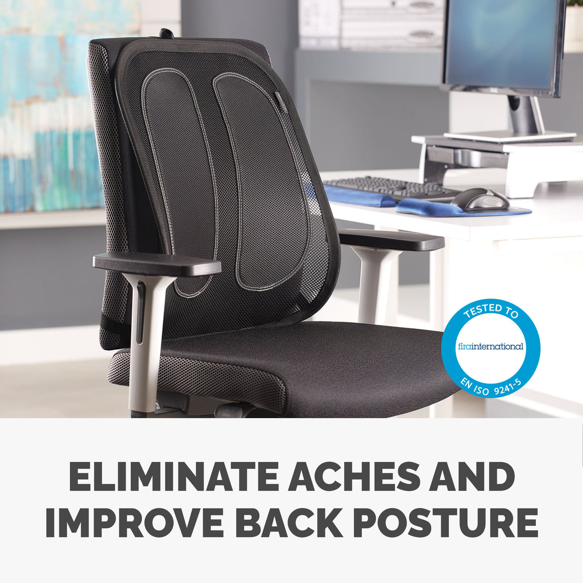 A few easy adjustments to your workstation can make a huge difference to your daily routine. At all times you should avoid straining your back muscles and putting your body at risk. With this Fellowes back rest for office chair, you can make sure that you are retaining the correct posture as it provides additional spinal support to maintain natural back curvature and the innovative design moulds to your body's contours. Eliminating the need for re-adjustment, the tri-tensioning attachment holds the office chair back support in place for a comfortable working environment. It's ergonomic design incorporates padded features for additional support, whilst the mesh fabric allows air flow for your personal comfort. Sitting in a chair without proper support can cause back discomfort, poor circulation, overall fatigue and long term issues which is why a using a Fellowes back support for office chairs is a necessity in any office or home environment in order to maintain your posture and improve overall comfort. This back rest for office chair can easily attach to any chair and is accredited against FIRA - an ergonomic accreditor for Fellowes.