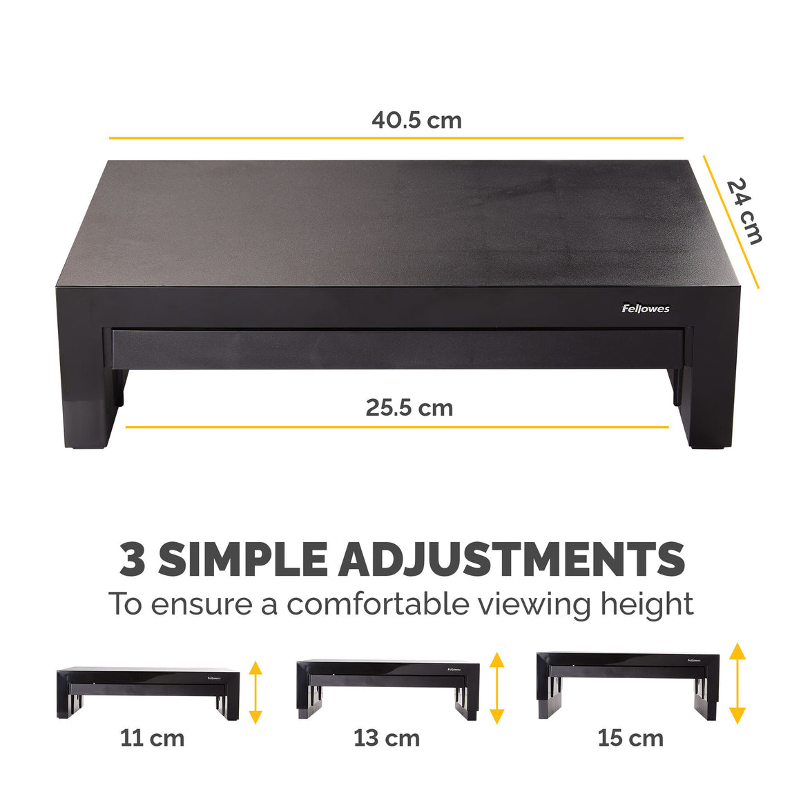 A few easy adjustments to your workstation can make a huge difference to your daily routine. Moving your head to view your screen or to read documents requires you to tilt and turn your neck and upper back. Positioning your screen incorrectly can put serious strain on your eyes, neck and shoulders which is why this Fellowes Designer Suites monitor stand is a necessity for your workspace as it allows you to place your monitor at a more ergonomically-correct viewing position to suit you. This adjustable monitor stand can support large CRT or TFT monitors with a maximum weight of 18 kg and its space saving design allows you to stow your business essentials underneath the monitor riser for in-office use or at home to help keep your workspace nice and tidy. Accommodate the Ideal viewing angle that best suits your needs, the Designer Suites computer stand features three height adjustable settings (Height Adjustments: 11/13/15cm) allowing you to find a comfortable screen position accustomed to you. This monitor riser has been tested by FIRA International Ltd to comply with the ergonomic requirements set out in European Health and Safety Legislation: EN ISO 9241-5.