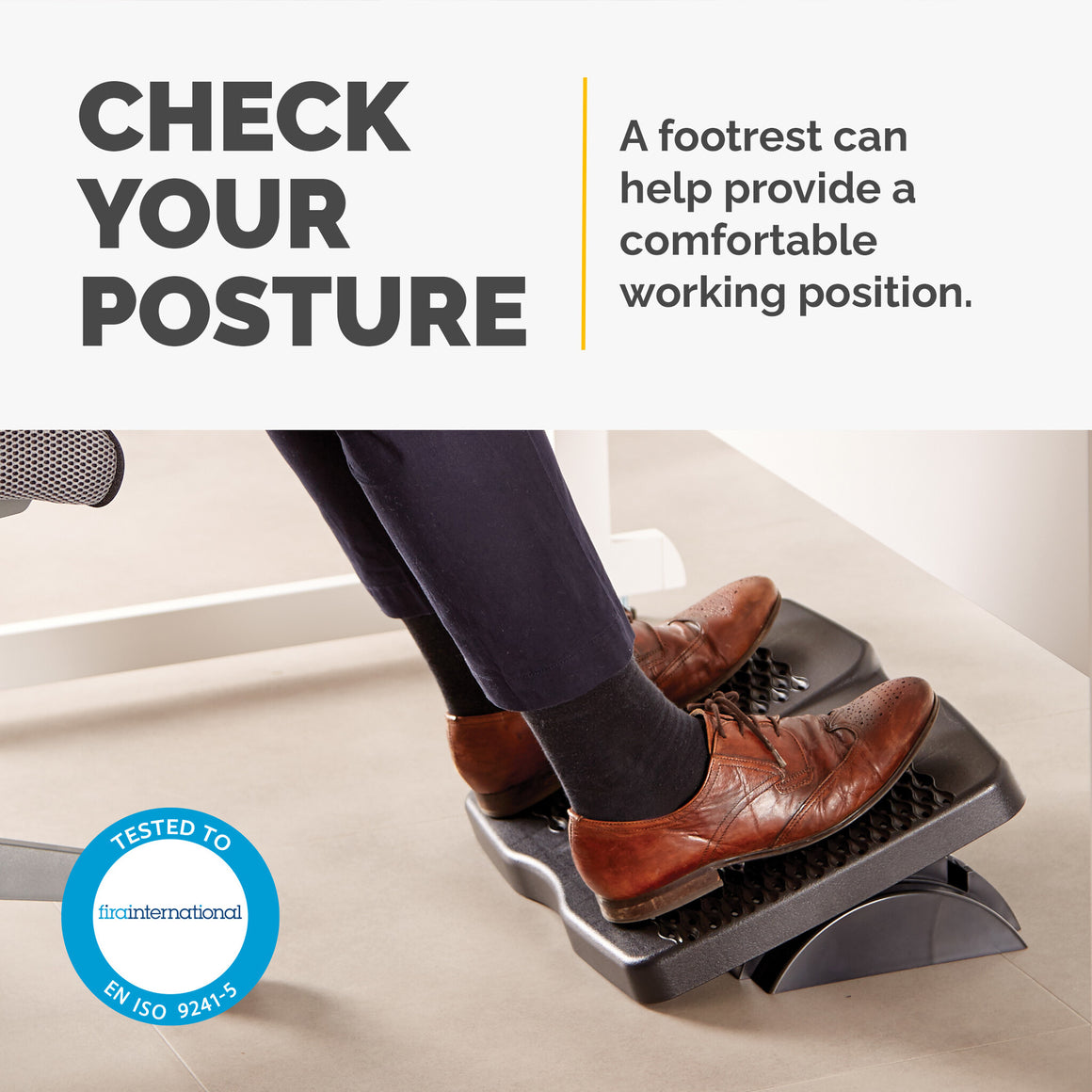 - MAINTAIN CORRECT POSTURE - Sitting in a chair without proper support can cause poor circulation, back and leg discomfort and overall fatigue which is why the Fellowes Refresh foot support is a necessity for maintaining the correct posture as you sit in your office chair