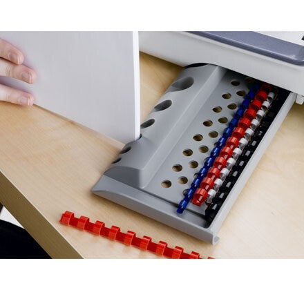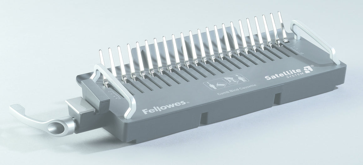 The Galaxy 500 is a high performance, manual comb binder ideal for large office, heavy duty use. Capable of binding up to 500 sheets and including many user friendly features, the Galaxy 500 is designed to make binding heavy workloads more manageable and enables you to easily produce a professional-looking bound document. This binding machine comes with the full width handle for easy punching of up to 28 sheets. Only the Galaxy range features the removable Satellite System. If you constantly find yourself fighting against a deadline, this feature allows one person to punch whilst the other binds, saving valuable time in the office. As with all Fellowes comb binders the Galaxy 500 comes with the angled comb rake to make loading punched sheets much easier and smoother. Vertical sheet loading ensures consistent punch alignment for improved punch accuracy. Includes the punch selection for A4 & A5 sized documents and back margin adjustment selector for thicker documents. Also comes with the front access, full size storage tray with patented comb and document measure for quick selection of the correct size supplies and a handy chip tray that automatically bursts open when full to eliminate jams. For the ultimate professional finish add style and colour to your documents through a wide range of Fellowes covers and combs. Includes a starter kit for 20 documents.