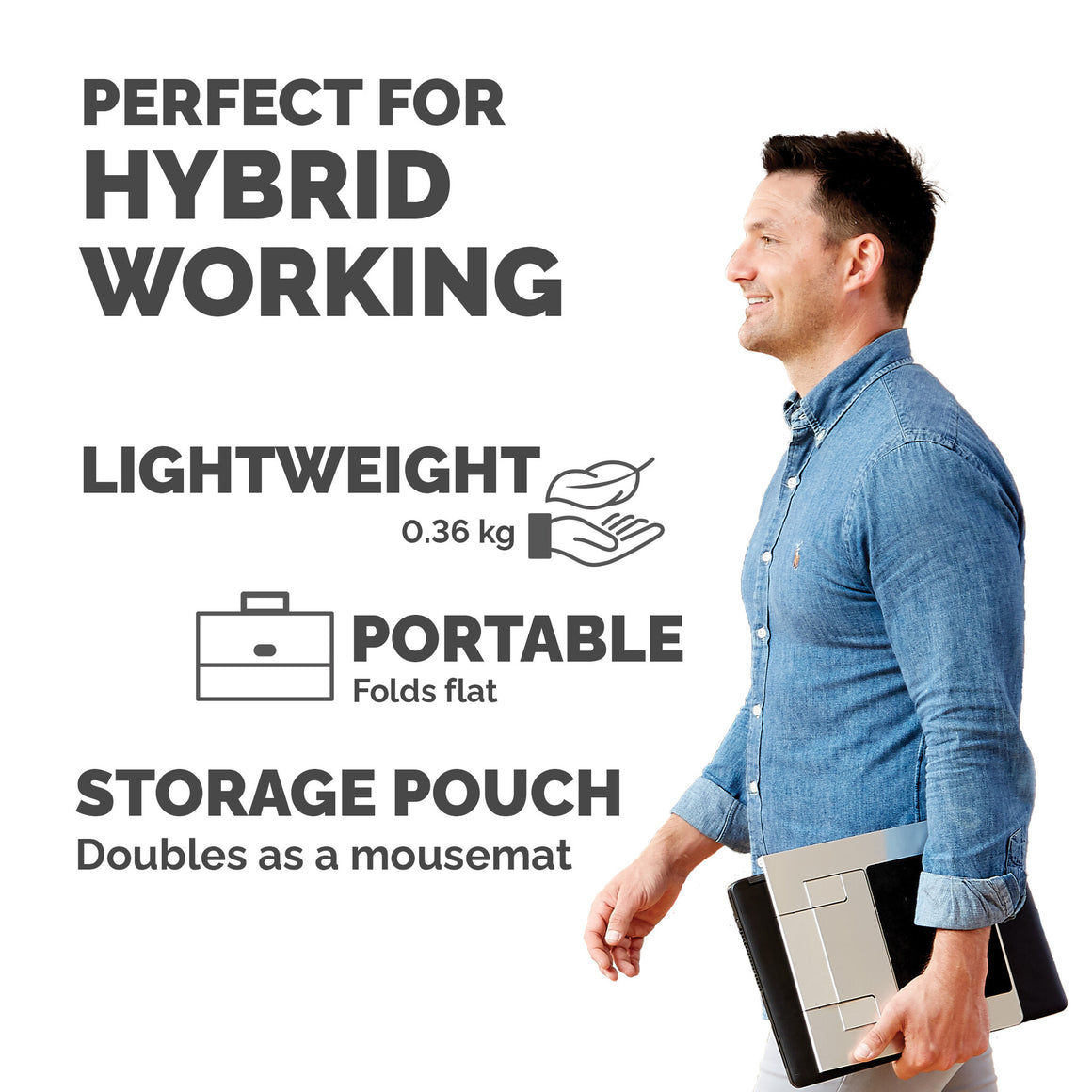 Fellowes Hylyft Portable Laptop Riser is designed to provide a lightweight and sturdy solution to allow you to work ergonomically wherever you work, be that in the home office, on-the-go or in the workplace. Work in both style and comfort with the Hylyft laptop riser from Fellowes which features a contemporary and stylish design. Whilst offering 6 simple height adjustments, the Hylyft laptop stand folds completely flat providing an elegant portable yet ergonomic solution which is ideal for in the office or on the go. Position your screen at a more comfortable viewing height with this Hylyft portable laptop stand which positions your screen to 6 viewing heights between 151-211mm. The Hylyft laptop riser raises your laptop screen to eye level and positions the screen at a more comfortable viewing height with simple adjustments, relieving the stress placed on your shoulders neck and eyes. Made from feather-light material Hylite, the Hylyft is perfect the perfect solution for someone working on a laptop at various working locations. The Hylyft also includes a pouch that prevents items getting scratched during transit, and can also be used as a mouse mat. Tested by FIRA International Ltd to comply with the ergonomic requirements set out in European Health and Safety Legislation: EN ISO 9241-5.
