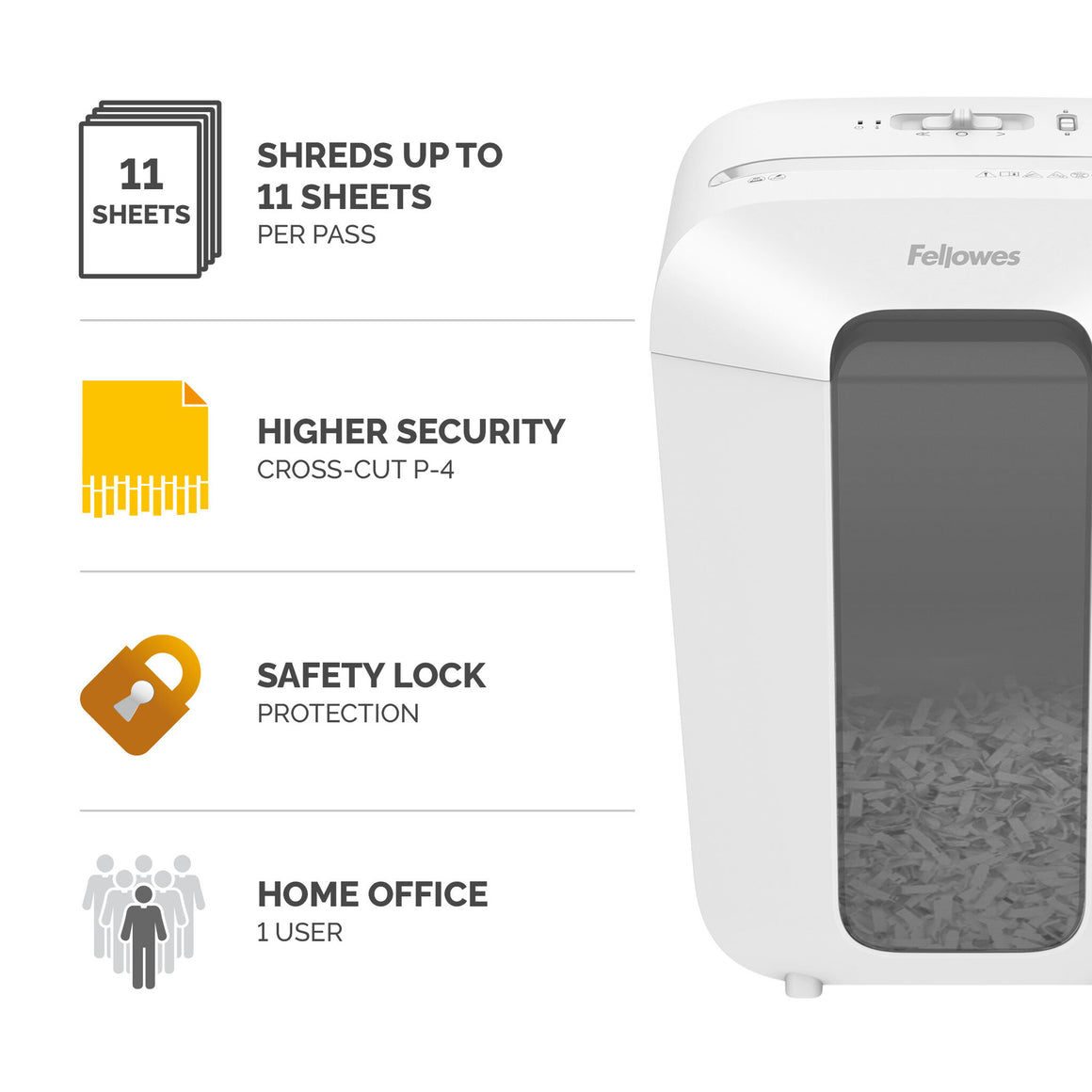 - HIGH SECURITY SHREDDING - The Fellowes LX70 cross-cut paper shredder can shred 11 sheets per pass into tiny 4 x 40mm cross-cut particles (High Security DIN P-4), so you can be sure that your confidential documents have been shredded securely