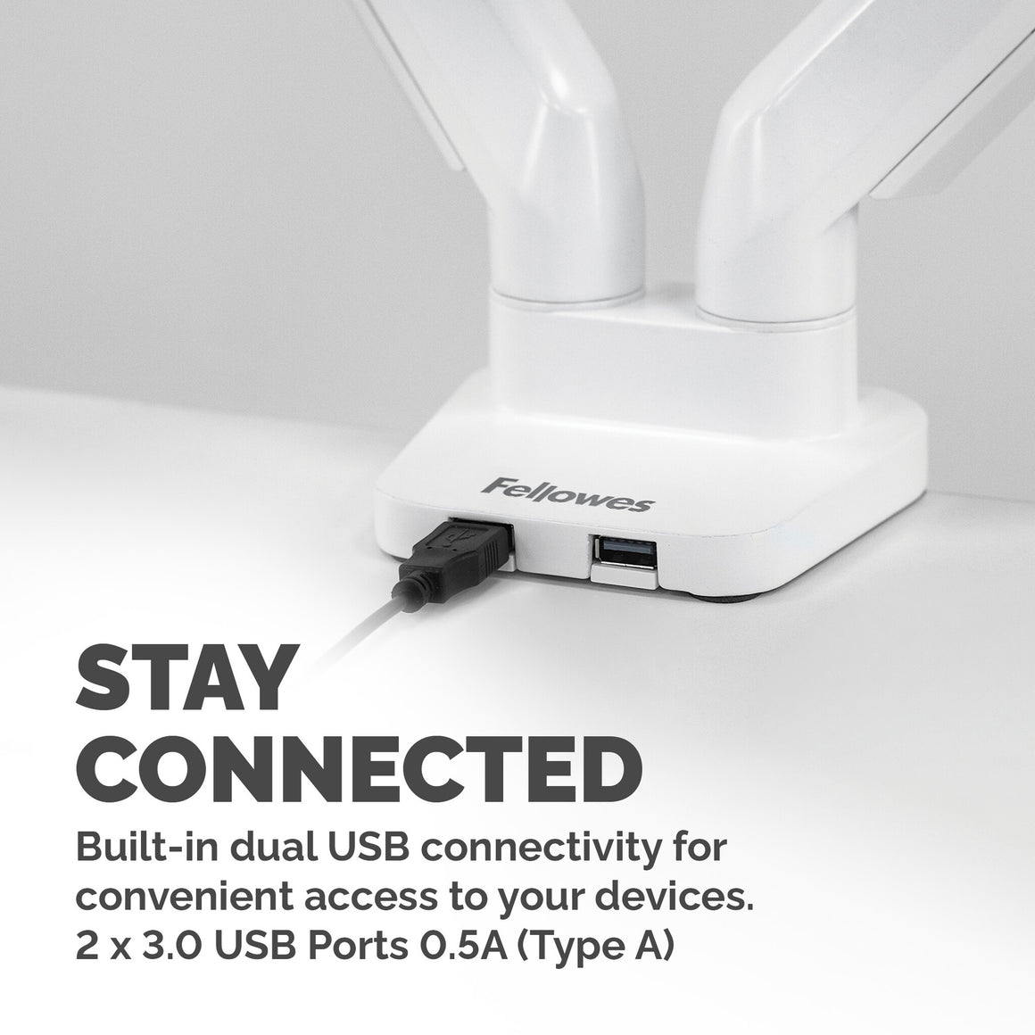 - BUILT-IN USB PORTS - Built in dual USB connectivity and intuitive cable management allows you to stay connected and minimise clutter at the same time with the Fellowes Platinum Series dual monitor arm