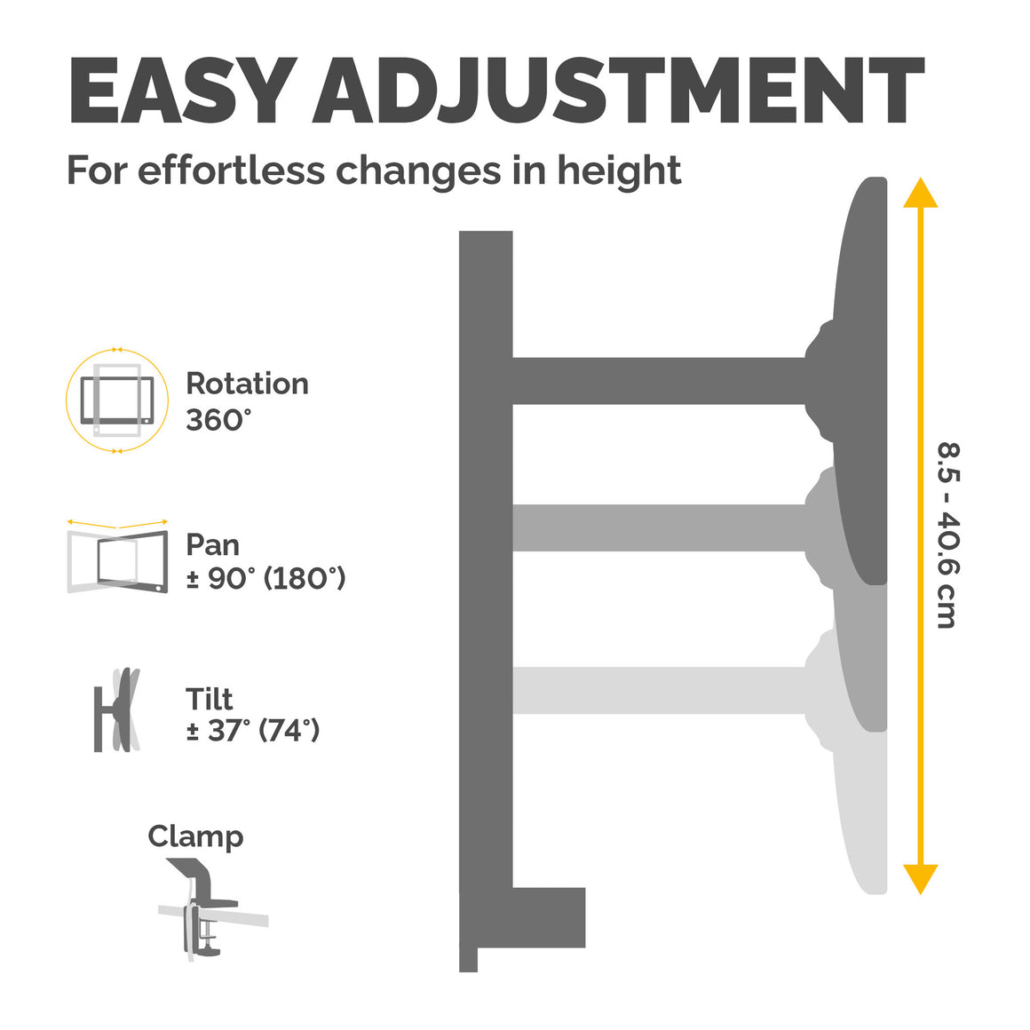 - ADJUSTABLE - This fully independent adjustable monitor arm can pan 180 Degree, tilt +/-37 Degree and can rotate 360 Degree for optimum viewing control