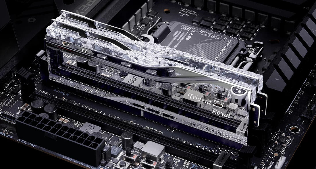 Trident Z5 Royal is the luxury-class of extreme overclock performance DDR5 memory designed for Intel platforms, featuring a crown jewel design with a crystalline light bar for a magnificent display of customizable RGB lighting and electroplated aluminum heatspreaders with a mirrored finish in gold or silver colors.