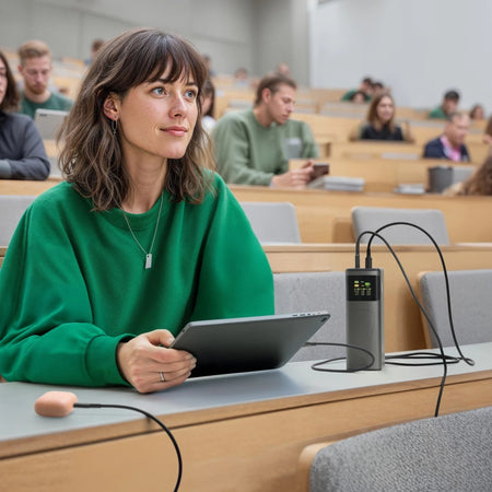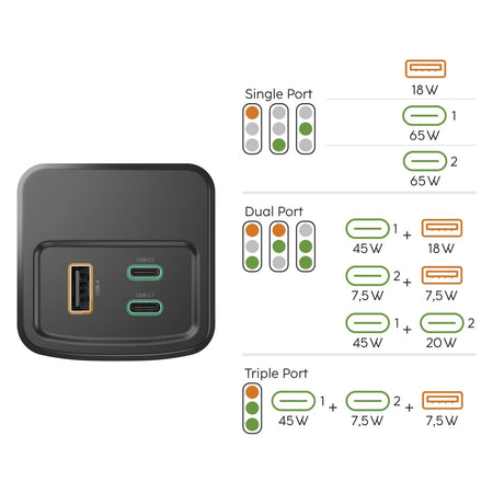 Powerbank provides a power boost on the go; the mobile charger can charge three devices simultaneously via two USB-C sockets and one USB-A socket
