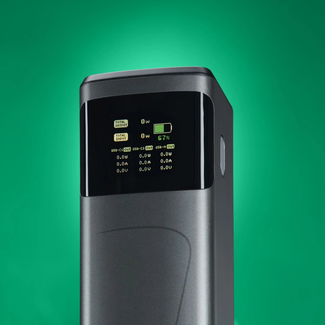 Detailed data at a glance: the high-quality TFT colour display of the Fast Charge powerbank shows the percentage of energy left in the mobile charger and the output power of the individual sockets and the total power in Watts