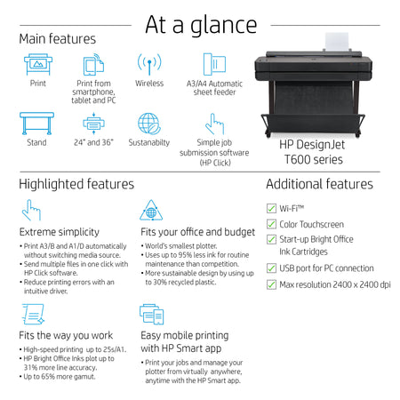 HP DesignJet T650 36-in Printer, printer stand, automatic sheet feeder, roll cover, printhead, introductory ink cartridges, spindle, quick reference guide, setup poster, power cord |