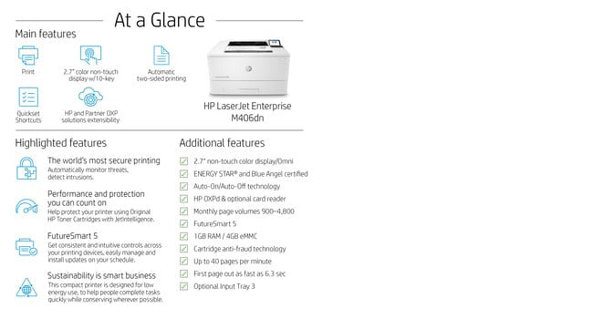 HP’s entry-level Enterprise-class printer with speeds up to 40 ppm[9] and strongest security.[1]