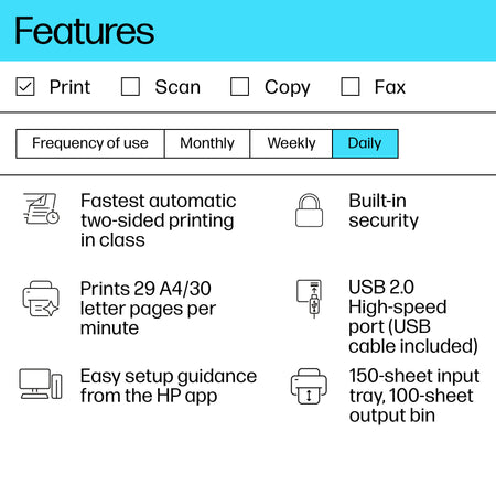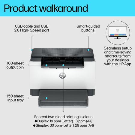 Super capable. Super compact. Increase productivity with this high-performance black-and-white printer in an award-winning compact design.[2] Experience the fastest two-sided printing in class[8] plus simplified setup and time-saving features with the HP app.[3]