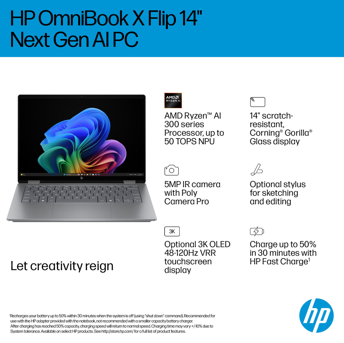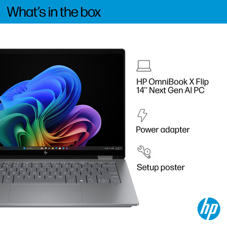 Let creativity reign with the HP OmniBook X Flip 14 Next Gen AI PC. With 4 versatile modes, this thin and light Next Gen AI PC enables you to work and play from anywhere, at any angle. AI-boosted power and speed, along with an all-day, fast-charge battery, keeps you going. While the 14" touch edge-to-edge display provides the best possible view.