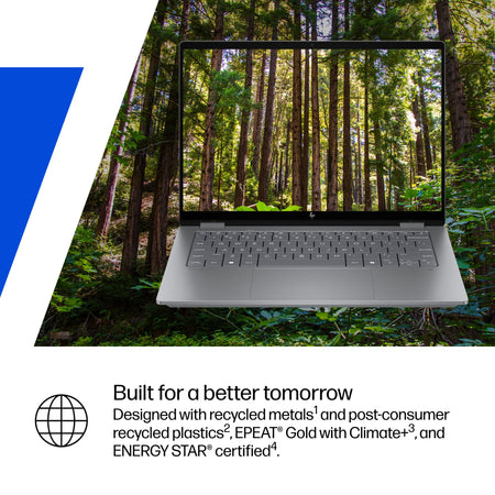 Ocean-bound plastic in speaker enclosure(s) and bezel; Recycled metal in cover, keyboard frame, base and hinge cap(s); Keyboard keycaps and scissors contain post-consumer recycled plastic |
