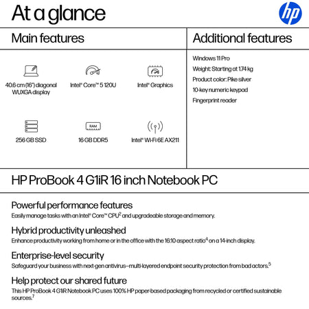 The HP ProBook 4 G1iR 16-inch Notebook PC provides growing businesses with commercial-grade performance, multi-layered endpoint security[5], and durability in an easily upgradeable design. Powered by the latest Intel processor[2] and long battery life, this feature-rich PC is future-ready for long-term productivity and helps enable hybrid work.