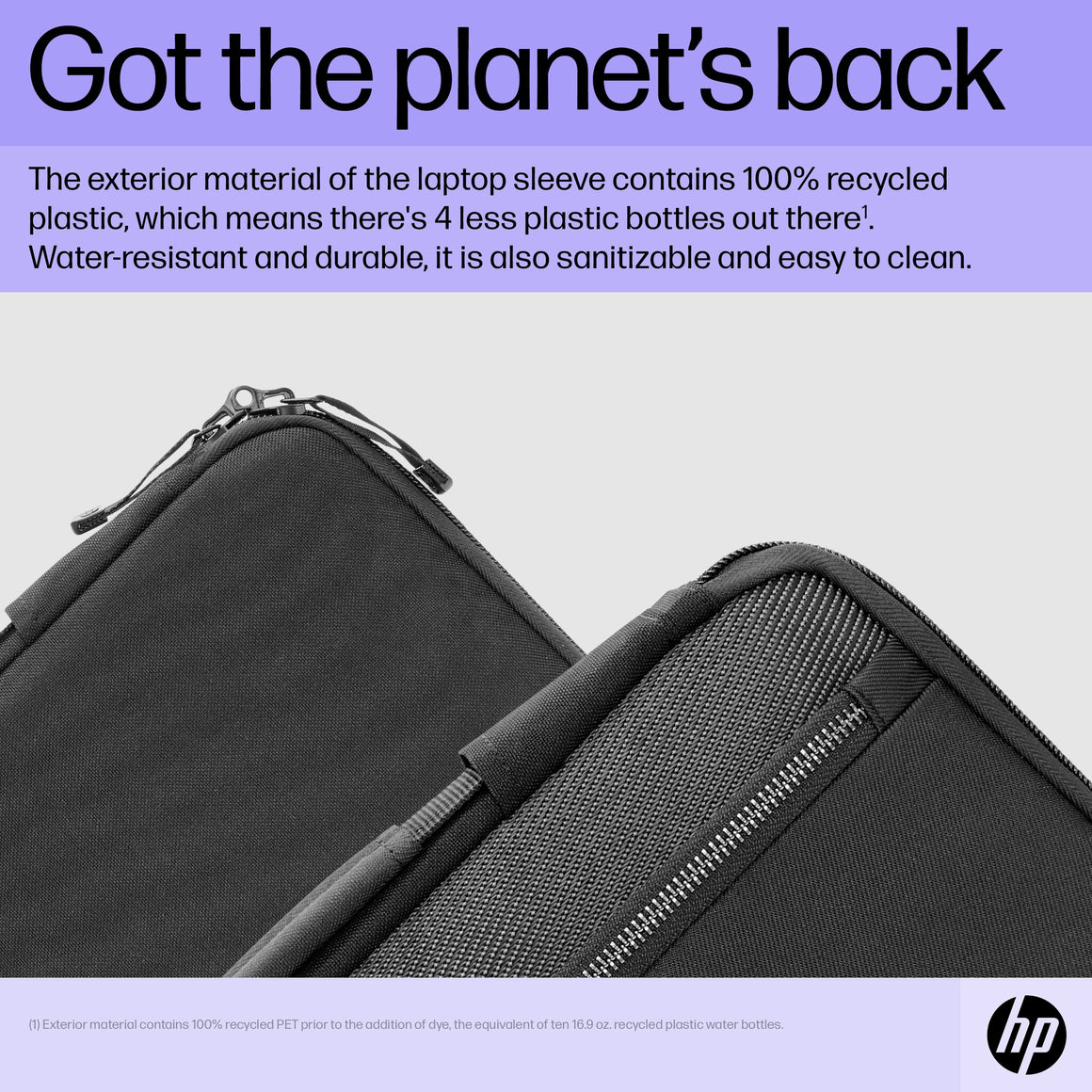 - Keep your devices protected and keep your commitment to the planet. The exterior material of the laptop sleeve contains 100% recycled plastic, which means there's 4 less plastic bottles out there[1]. In addition to being water-resistant, each laptop sleeve is made from durable, easy to clean sanitizable material[2].