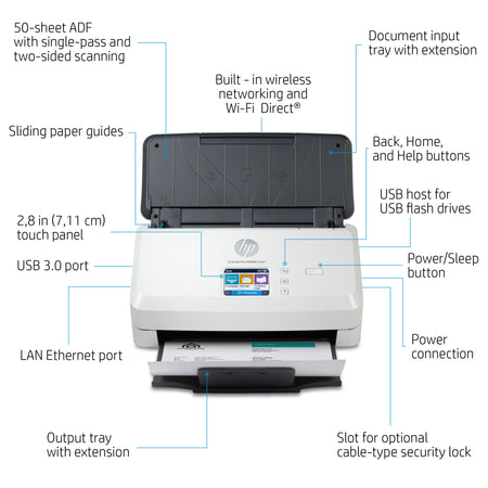 Get fast, two-sided scans in a single pass – recommended for 4,000 pages per day Fast, affordable, and designed to handle everything from simple colour jobs to complex workflows. Quickly and reliably digitise larger office projects with business scanner speeds up to 40 ppm/80 ipm and a 50-page ADF.[1] Recommended for 4,000 pages per day.