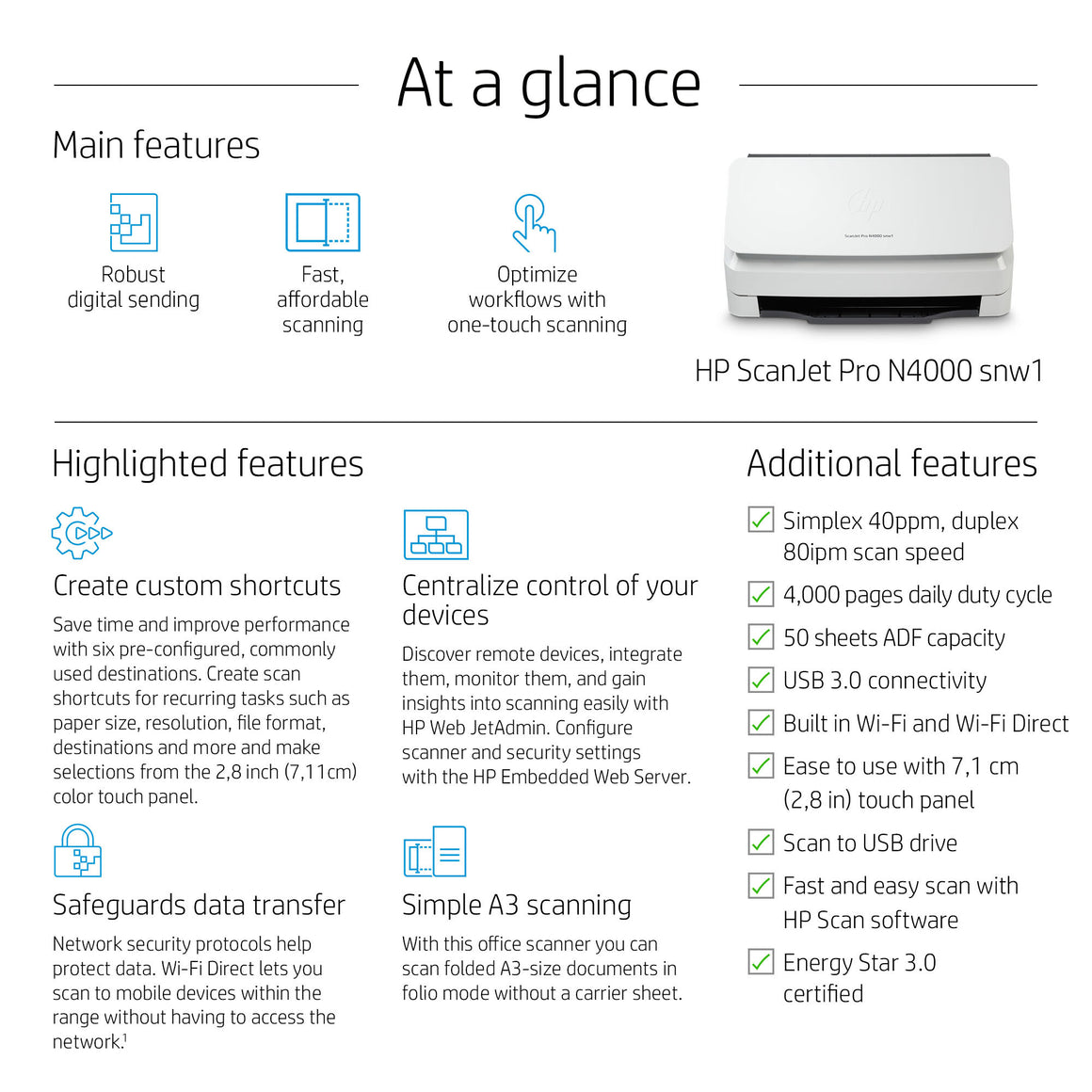 HP ScanJet Pro N4000 snw1 Sheet-feed Scanner; Power cord; Power adapter; USB cable; Scanner engine; Flyers; Install guide |