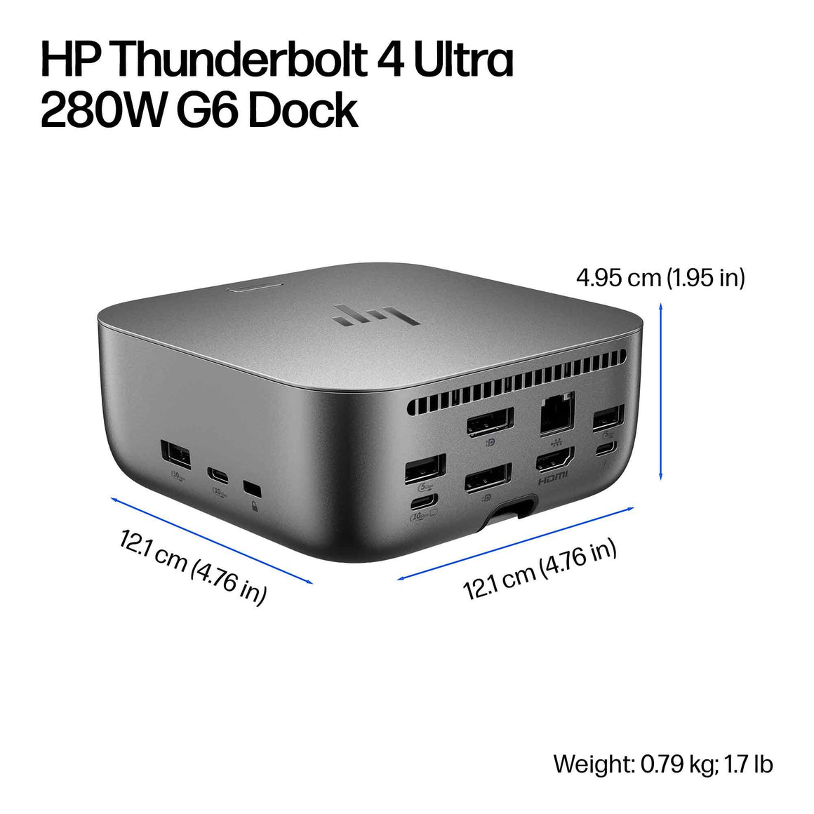 HP Thunderbolt 4 Ultra 280W G6 Dock; 330 W power adapter; Thunderbolt™ 4 and 4.5 mm power barrel combination cable (1 m); Power cord; Product notice; Warranty card |