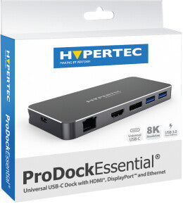 Experience simple and effective USB-C connectivity with the ProDockEssential Gen 4 Universal USB-C Docking Station. This versatile dock offers a straightforward solution for charging, data transfer, and video output from USB-C devices. Users can select between HDMI or DisplayPort for video output, or use both simultaneously, supporting resolutions up to 4K (2160p at 60Hz).