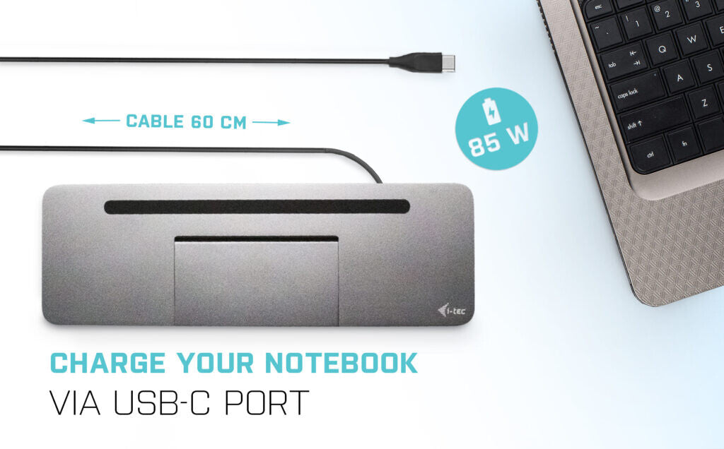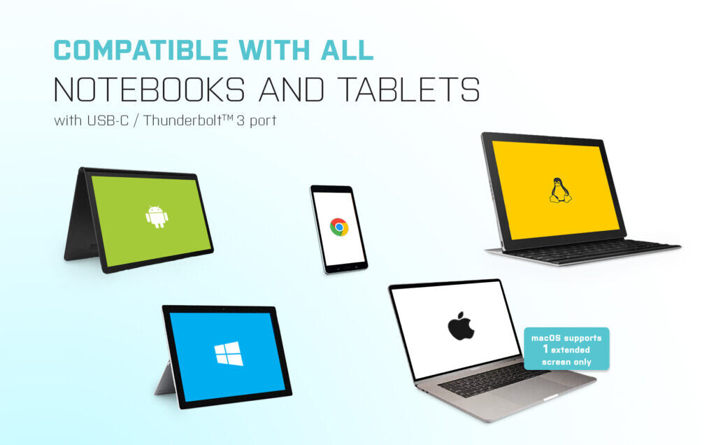 Plug the docking station into the USB-C or Thunderbolt 3 port of your computer with just a single cable (60 cm) and you can start using it immediately. Drivers are installed from the system automatically. The docking station was designed to also be used as an ergonomic stand for your laptop or tablet.