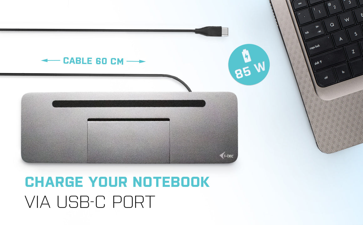 Ergonomic metal USB-C docking station with support for up to 3 external monitors. The station is compatible with any laptop equipped with a USB-C or Thunderbolt 3 port (the 60 cm integrated cable is long enough to connect all laptops with screens up to size 15“). The dock provides 4x USB ports, reliable and quick connection to company networks thanks to an integrated LAN port and up to 85 W power delivery. The station’s design also allows it to be used as a stand for a laptop.