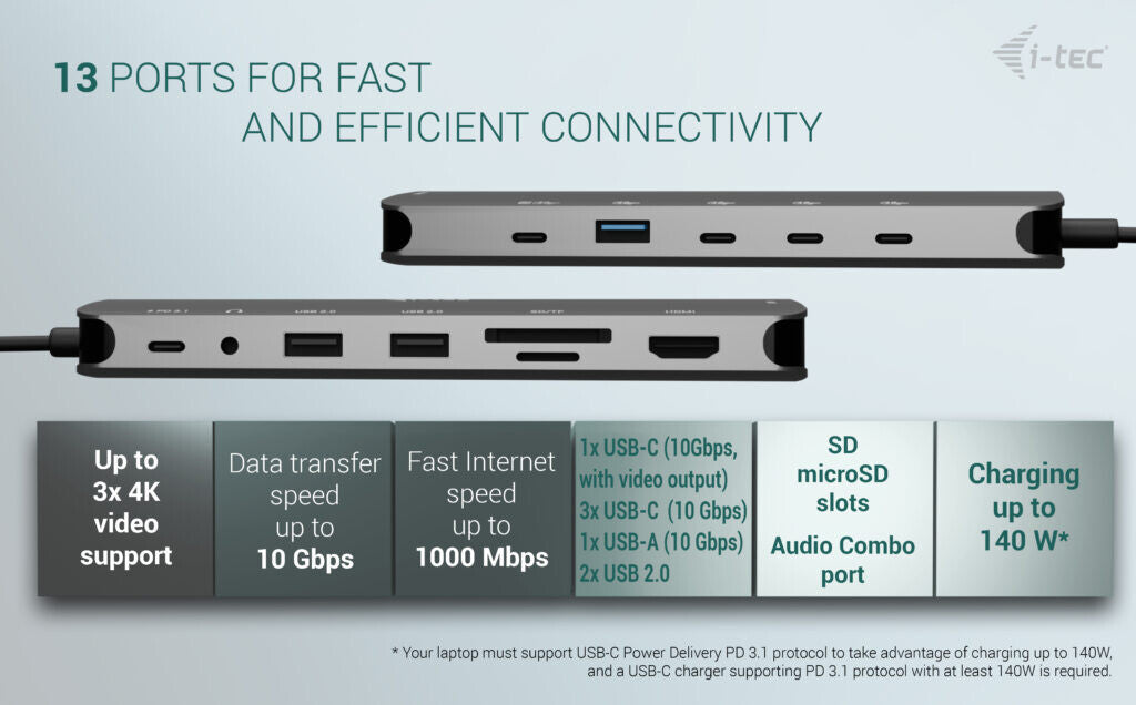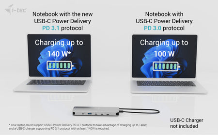 ** If your laptop or tablet supports the new and modern USB-C Power Delivery PD 3.1 charging protocol, the docking station will offer charging power up to 140W (if you have PD 3.0 protocol, the charging power will be up to 100W)