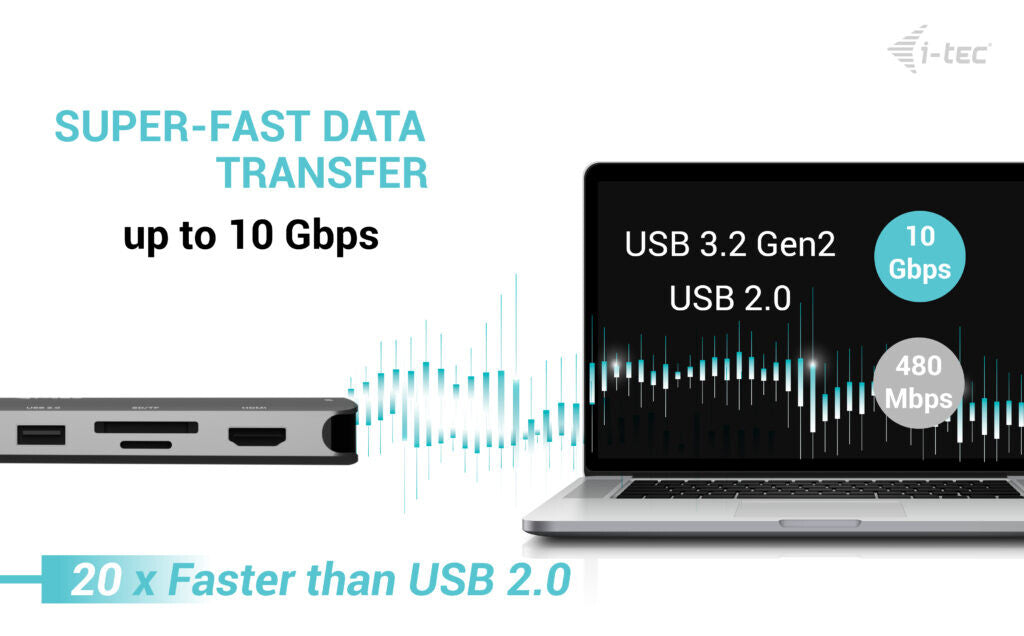 Small but very powerful metal USB-C docking station capable of supporting up to three external monitors simultaneously*. Simply connect your laptop or tablet (no need to install drivers) and reap the benefits of quick USB data transfer, connection to the internet via a LAN port, and the ability to connect your headset. And of course, the docking station can also power your laptop with up to 140 W **, meaning you will be able to charge all laptops and tablets that support charging via USB-C (USB-C Power Delivery).