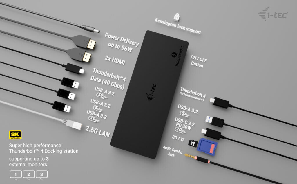 Ultra-high performance, ultra-fast data transfer, and support for resolutions up to 8K/60 Hz. One of the most powerful i-tec docking stations on the market!