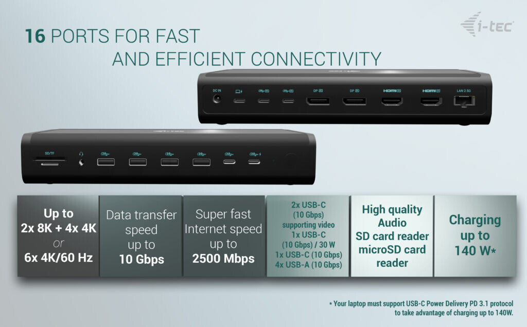 ** If your laptop or tablet supports the new and modern USB-C Power Delivery PD 3.1 charging protocol, the docking station will offer charging power up to 140W (if you have PD 3.0, the charging power will be 100W)