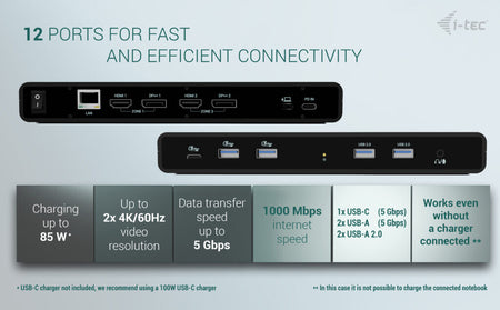 Plenty of ports, a reliable and fast connection to the corporate network thanks to the integrated LAN port and support for installation behind a monitor all make this docking station the ideal companion for true professionals. The docking station can be used when simply connected to a laptop (without a USB-C charger), or with a USB-C charger (not included). In this case, it supports charging of a laptop or tablet, up to 85 W of power.