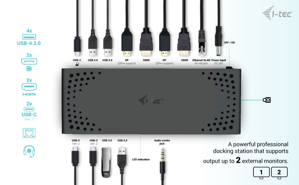A powerful office docking station supporting super-fast USB Gen 2 ports. Dock supports output to up to two external monitors in up to 4K high resolution. The dock can be used with virtually all notebooks as it supports connection to all common ports: USB 3.0, USB-C and Thunderbolt” 3/4, while supporting all common current operating systems.