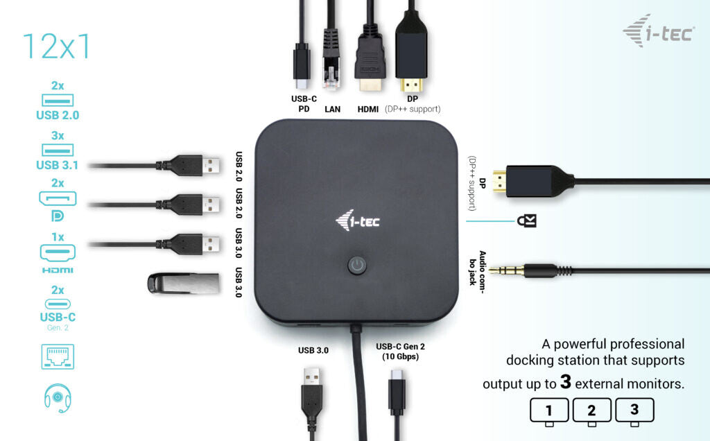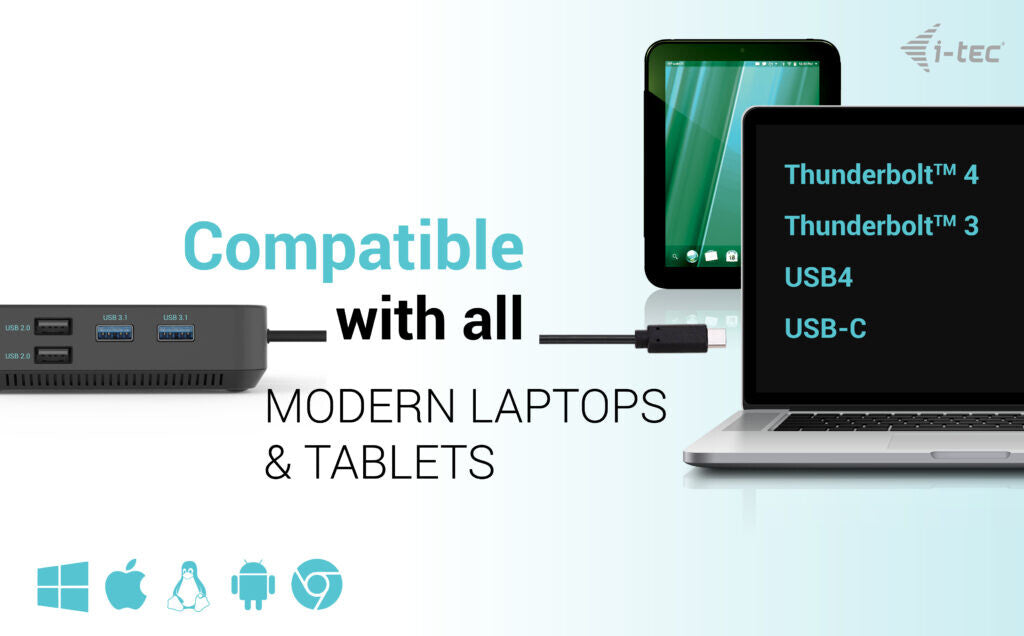 A high-performance USB-C office dock that supports up to 3x external 4K monitors. The dock is compatible with any laptop equipped with a USB-C, USB4 or Thunderbolt 3/4 port. Of course, it supports charging of your laptop or tablet, up to 100 W.
