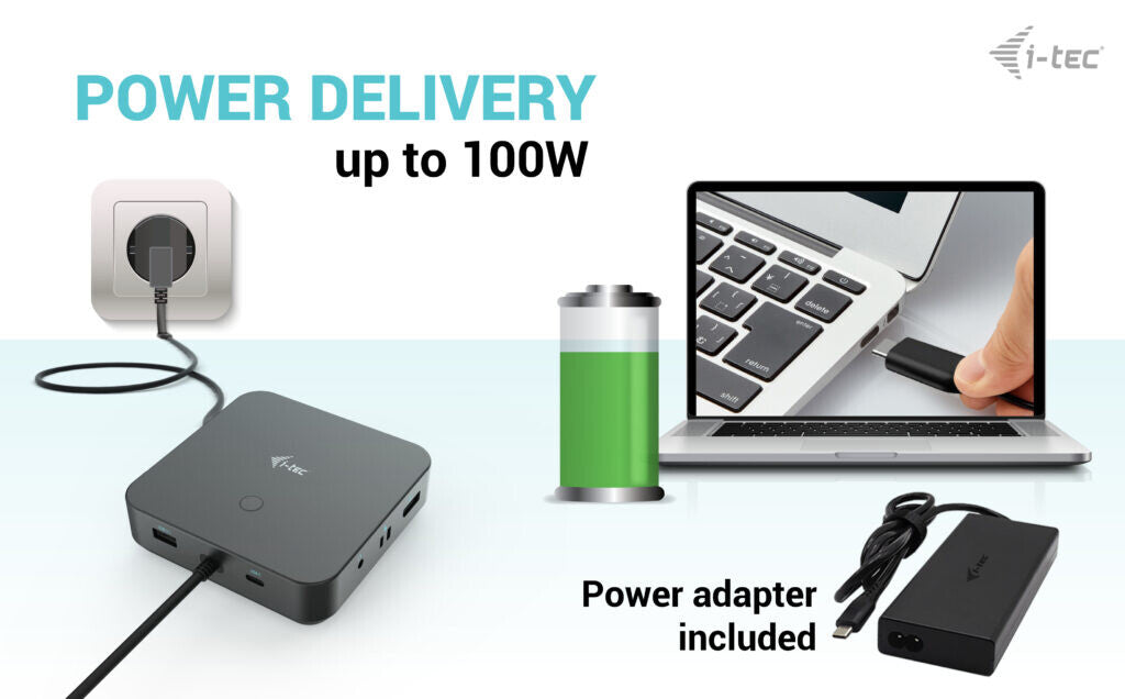The dock can be used without a power adapter connected. In this case, the video outputs, LAN (RJ-45), audio/mic and both USB 2.0 ports will always be functional. However, the USB 3.0 ports and the USB-C data port may not work when connecting devices with higher power requirements (e.g. SSDs, especially NVMe drives). In this case, the docking station may shut down. We recommend using the docking station with a power adapter connected to ensure that all ports are used and that maximum data transfer speeds are achieved. (The adapter is included in the package).