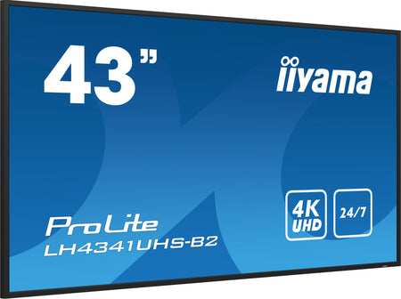 Set in a slim bezel, the iiyama LH4341UHS is a professional digital signage display offering 24/7 operating time in portrait and landscape orientation. This 500cd/m² high brightness IPS panel with 4K UHD resolution (3840x2160) provides exceptional colour and image performance. With the built-in media player you can play your favourite music and show your most beautiful videos, photos and images directly on screen.