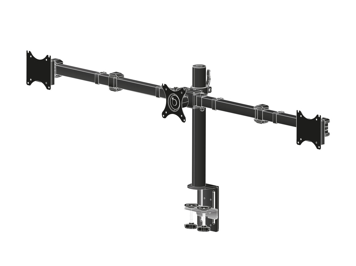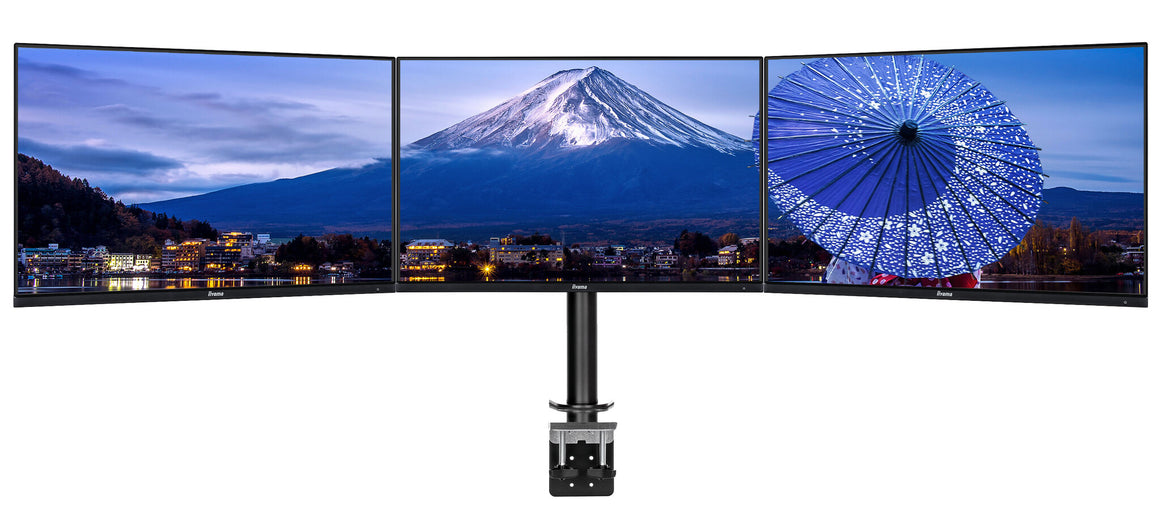 The iiyama DS1003C-B1 is a desk mount for three flat screens up to 27”. Thanks to the arm you can create a triple monitor setup even if your desk space is very limited, and the cable management system helps to keep your workplace tidy. Broad adjustment capabilities, including tilt, height and rotation, the arm offers, allow you to easily adjust the position of the screens to your preferences assuring comfortable and healthy body posture.