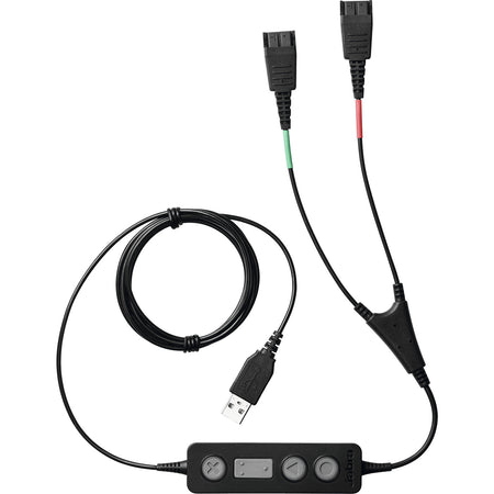 - Jabra LINK 265 USB/QD Y-training cable connects two Jabra Quick Disconnect (QD) headsets to one PC, so supervisors can either stay muted or join the conversation