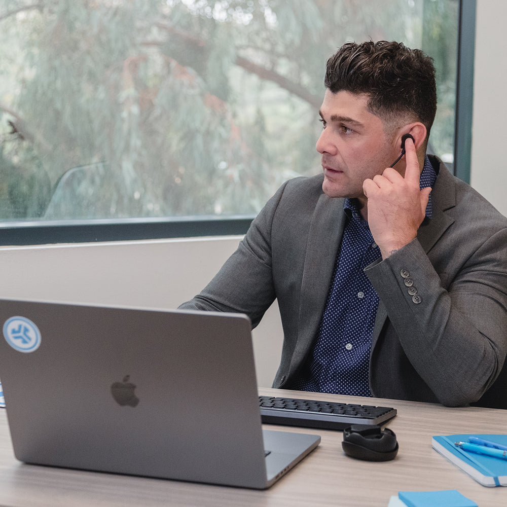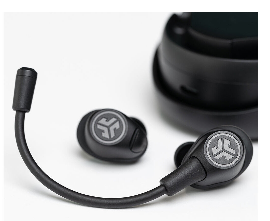 Meet the ultimate solution for the working professional: JLab Work Buds in-ear headset. With 55+ hours of total playtime, you'll have more than enough juice for all your conferences, calls and more. Say goodbye to muffled calls and hello to crystal clear communication with the detachable noise-canceling boom mic that fits either earbud. And, you'll never have to dig through your bag for your earbuds again thanks to the convenient USB-C charging dock that keeps everything organized and charged. Plus, with Bluetooth Multipoint technology and the JLab App, you can switch between devices and customize your sound to your heart's desire.