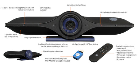 An impressive conference room video sound bar with AI-powered Intelligent Zoom, four stereo duplexed microphones and two all-range speakers, coupled with a Bluetooth remote control and a magnetic privacy cover, this video sound bar is a must for all conference rooms.