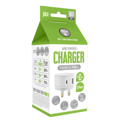 Keep your mobile devices refreshed and ready to go. Plug the Juice® charger into a wall socket and use your existing USB-C cable with your device to activate faster charging. Alternatively, you can use your existing USB-A cable to charge by plugging the USB end into the USB port on the Juice® mains charger – or use both ports to charge two devices at once! Plus with a 30W USB-C Port, you can easily fast charge the latest Samsung mobile devices as well!