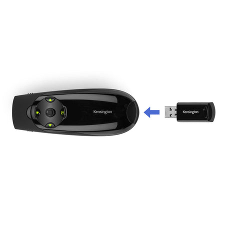 The Kensington Presenter Expert™ utilises a bright green laser (x10 brighter than traditional red lasers), making it ideal for use when presenting on bright LED or TV displays. Featuring an intuitive four-way joystick, the presenter can be used like a mouse with up/down and left/right control. The 2.4GHz wireless receiver stores inside the body of the presenter when not it use.