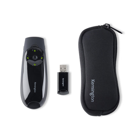 The Kensington Presenter Expert™ utilises a bright green laser (x10 brighter than traditional red lasers), making it ideal for use when presenting on bright LED or TV displays. Featuring an intuitive four-way joystick, the presenter can be used like a mouse with up/down and left/right control. The 2.4GHz wireless receiver stores inside the body of the presenter when not it use.