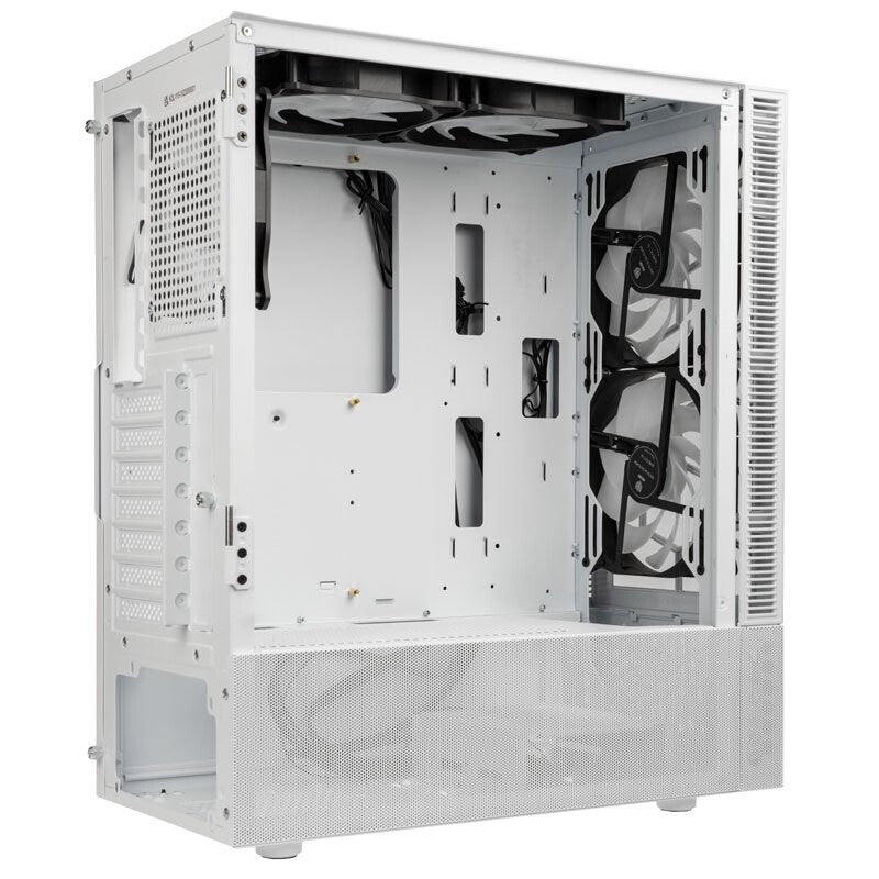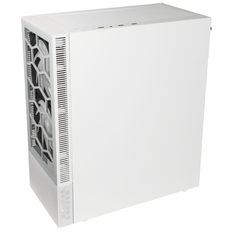 This is the Glass model in black. The front panel is manufactured from tempered glass, with subtle mesh side ventilation. To ensure this chassis has ample airflow, the dedicated PSU shroud is formed with mesh panelling. As the black model, the exterior, interior, and shroud are all black, with a two-tone material finish for a bold effect.