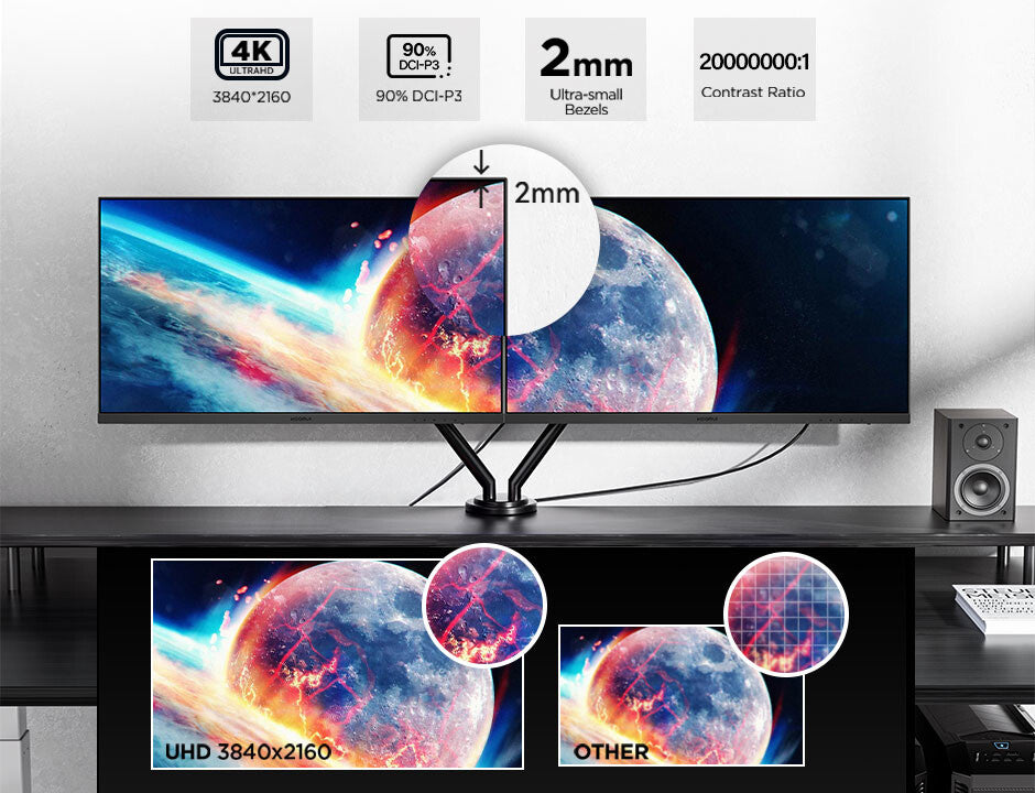 90% DCI-P3 color , UHD 3840x2160 resolution, and 100% sRGB deliver accurate, vibrant colors and sharp, detailed images for an immersive experience.