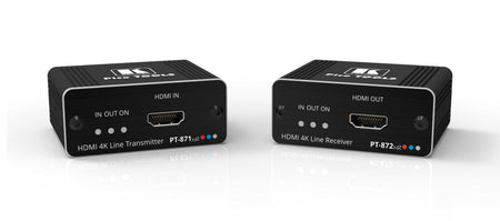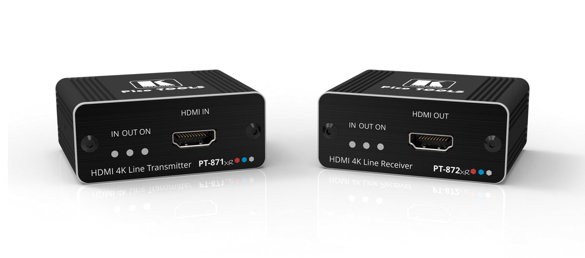 PT−871/2xr−KIT is a high−performance, long−reach DGKat™ 2.0 extender kit for 4K@60Hz (4:4:4) HDR HDMI and HDCP 2.2 signals and 2−way powering over twisted pair. The PT−871xr transmitter converts the HDMI input signal into a DGKat™ 2.0 signal. The PT−872xr receiver converts the transmitted DGKat™ 2.0 signal into an HDMI signal. PT−871/2xr−KIT extends video signals to up to 60m (200ft) at 4K@60Hz (4:4:4) resolution and up to 70m (230ft) at 4K@30Hz (4:4:4) 24bpp resolution over Kramer shielded cables.