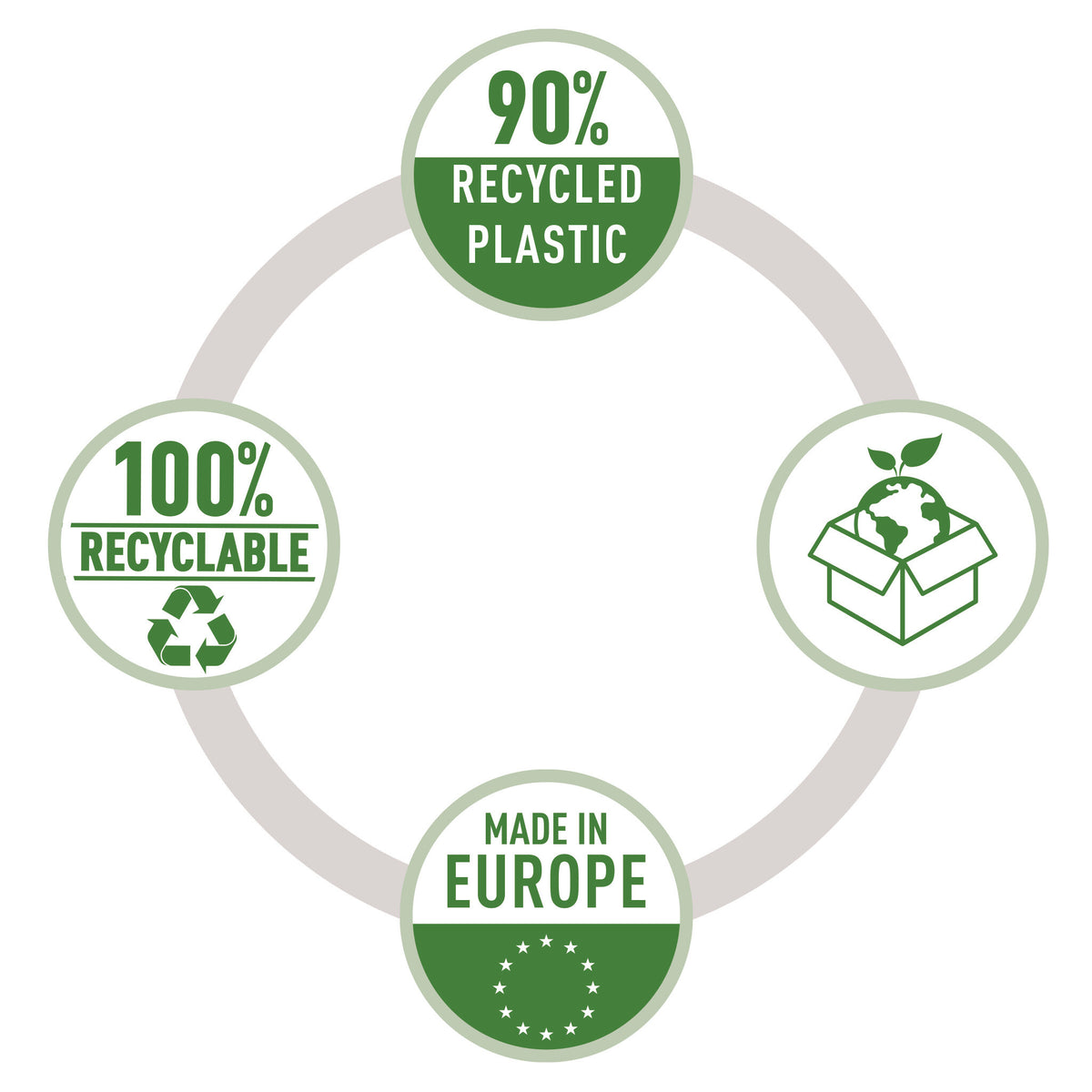- Made from 90% (pre-consumer) recycled plastic, externally audited and certified by UL and is 100% recyclable