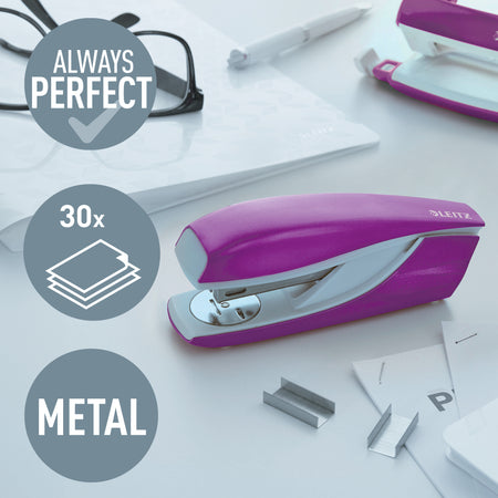 Metal stapler in catwalk colours for everyday use. Robust and reliable. Patented Direct Impact Technology and Leitz Power Performance staples P3 (24/6, 26/6) ensure perfect stapling every time.