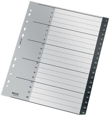 Premium quality extra wide A4 Folder Divider, 1-20 numerical tabs tabs. 90% (pre-consumer) recycled plastic and 100% recyclable. For clear organisation of A4 documents, helps in keeping track of important notes or school paperwork, for home, school or office use. This robust index perfectly complements other products from the Leitz Recycle range and is made to last. Modern and contemporary green stationery that will look great at home and in the office. With the eco friendly Recycle range from Leitz you can both improve your office environment – and the environment of our planet.