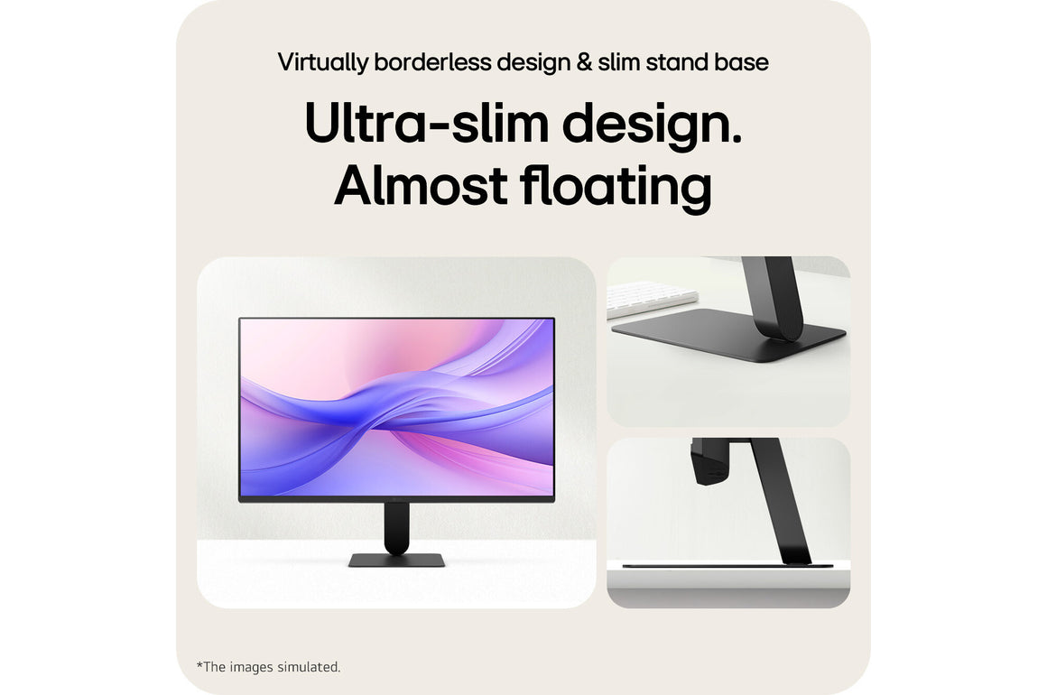 Experience more screen and less distraction with the ultra-slim bezel and minimal slim stand base, featuring a 4-side virtually borderless design. The floating-like stand enhances the clean, weightless aesthetic, while the seamless screen feel delivers an immersive visual experience—ideal for dual setups or minimalist workspaces.