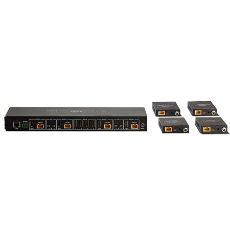 Professional HDMI Content DistributionThis 4x4 matrix allows for the distribution of HDMI content to 4 separate locations, using the included receivers, at up to 70m in distance, perfect for splitting or switching content to various displays in sports bars, events or residential home cinemas. Each Cat.6 extension output also has a simultaneous HDMI output for local monitoring for each zone, or for a larger install with closely located displays. Each port also support simple independent downscaling to 1920x1080, for consistently ensuring peak performance on a variety of displays. Professional EDID management ensures maximum compatibility with both the source devices and displays.The following distance and resolution combinations are supported:- 70m with Cat.6 cable: 1920x1080@60Hz 4:4:4 8bit, 3D@1920x1080- 40m with Cat.6A cable: 3840x2160@60Hz 4:4:4 8bit / 4:2:2 12bit